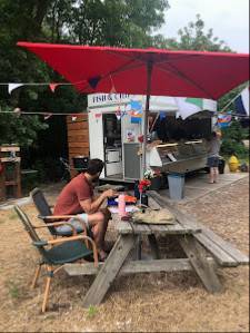 Prima kibbeling, lekker als tussendoortje tijdens de fietstocht. Leuk aangekleed hoekje.7 euro voor een portie.